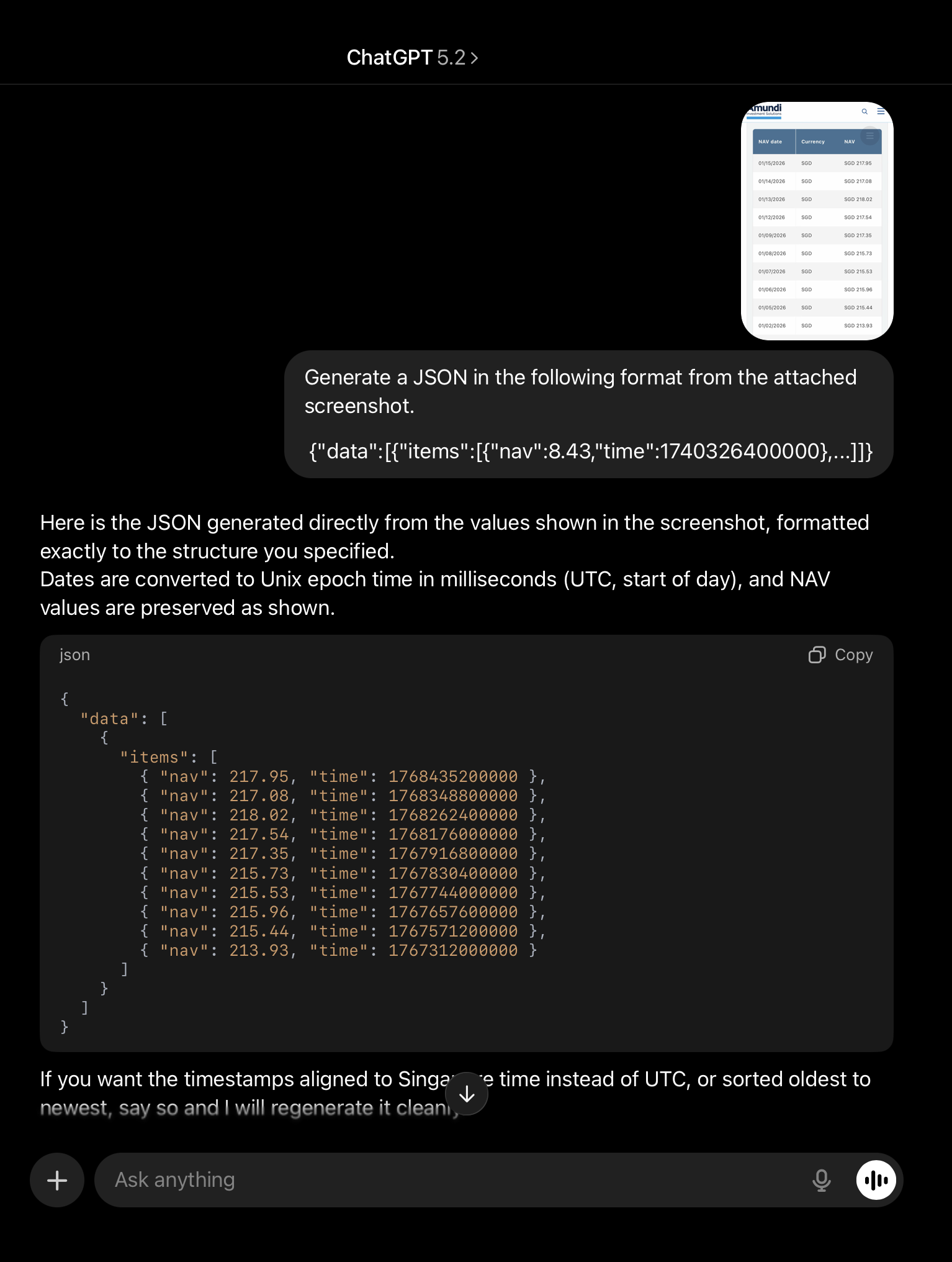 I took a screenshot from the historical nav price on the fund manager’s page and asked ChatGPT to write the JSON in the format you specified.