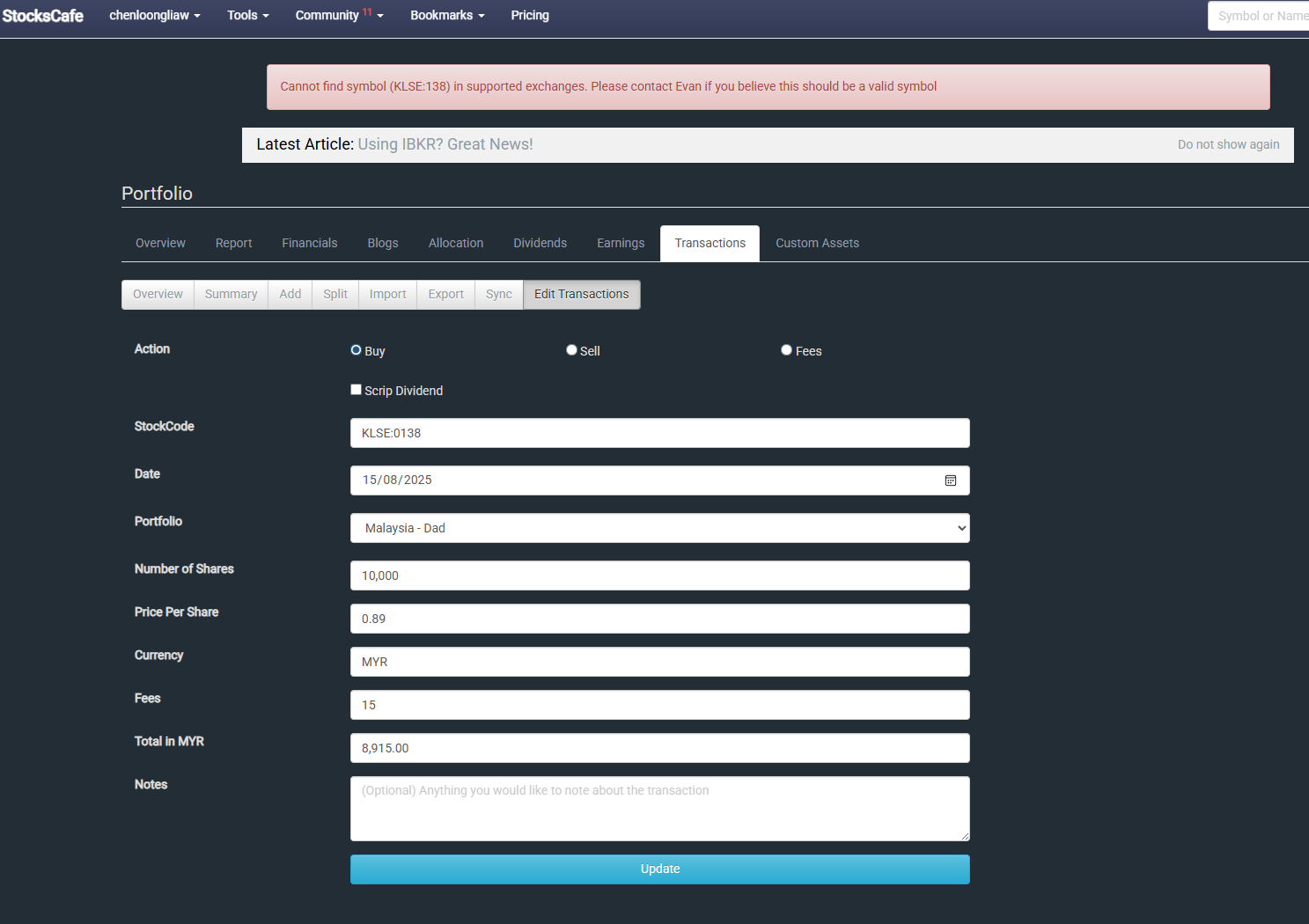 “Cannot find symbol (KLSE:138) in supported exchanges. Please contact Evan if you believe this should be a valid symbol”