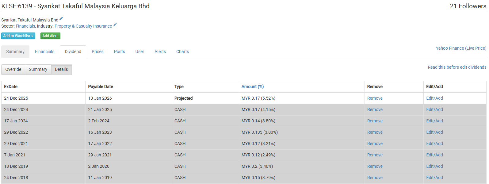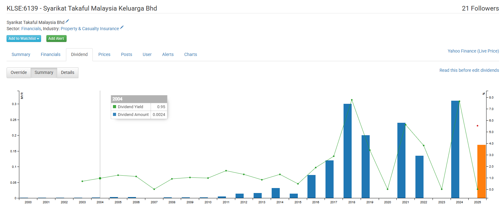 In the details page for KLSE:6139, I can see dividends paid every year. However in the summary 2020 and 2023 is shown as 0.